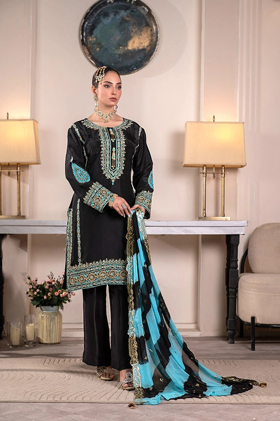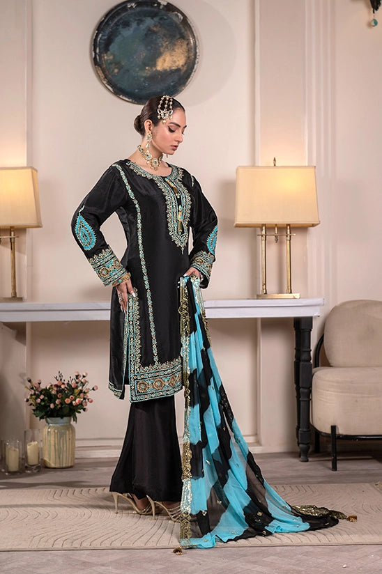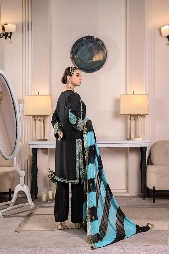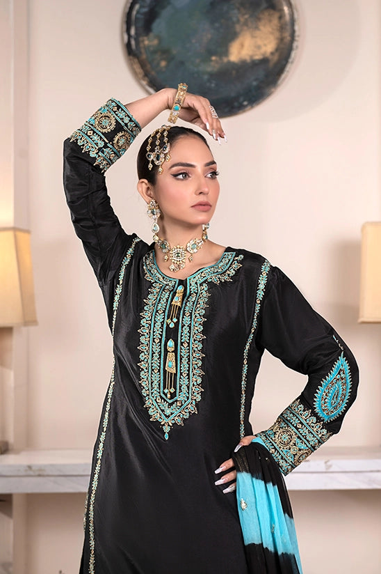 Embrace elegance with this ensemble featuring a black raw silk shirt that steals the spotlight with it’s intricate embroidery and machine work of Kora, Tilla, and Dabka. Complete the look with straight cut Palazzo pants and a chiffon dupatta embellished with tilla embroidery in tie and dye. Every detail exudes sophistication. The finishing touch of feroza tassels on neckline adds a touch of luxury, making it a statement of sophistication.