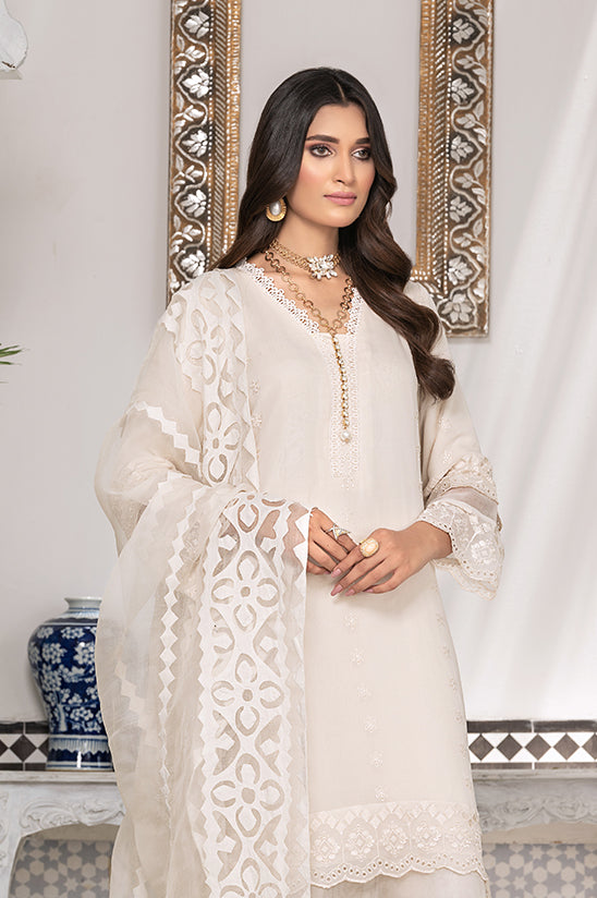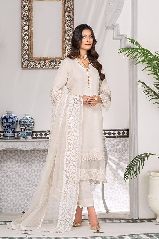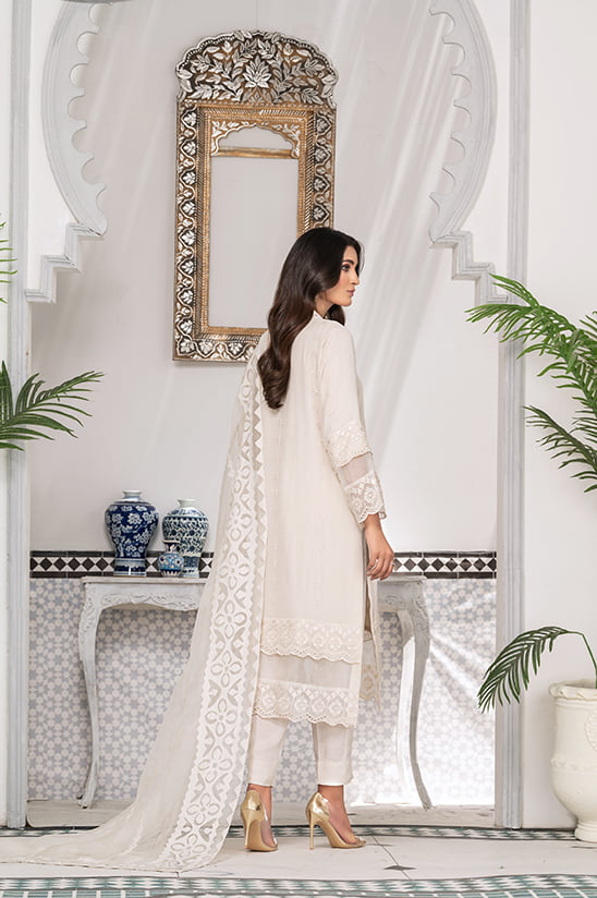 A blissfully ethereal design, ’Gul e daoodi’ features a celestial creamy white canvas layered with delicate borders depicting a finely detailed lace and a mosaic in dreamy hues of white. Paired with a raw silk trouser and a diaphanous organza dupatta Hand work Appliqued in the finest hues of vanilla with a festoon of dainty embroidered flora on all four sides; this look will cater to easy, understated glamour for summer soirées.