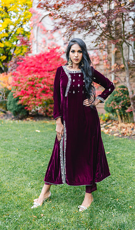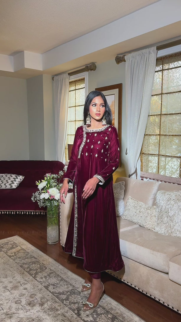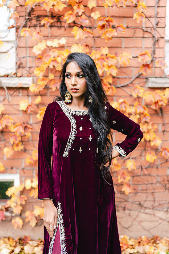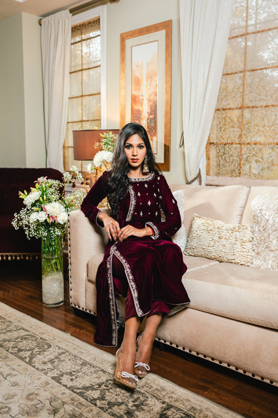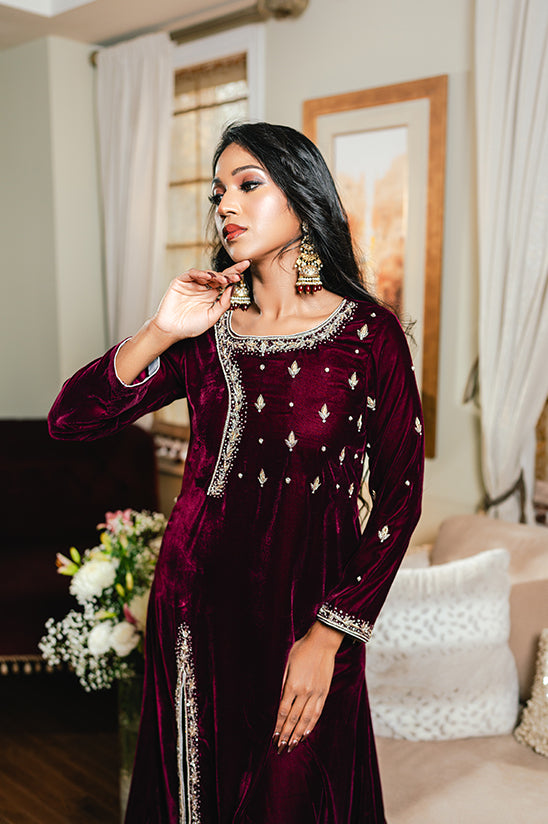 Opulent and regal, Inara Burgundy is a statement piece crafted from luxurious velvet in a deep, rich tone. The long shirt with side slit is intricately adorned with handwork of kora, tilla, and dabka, showcasing fine craftsmanship and timeless artistry.
