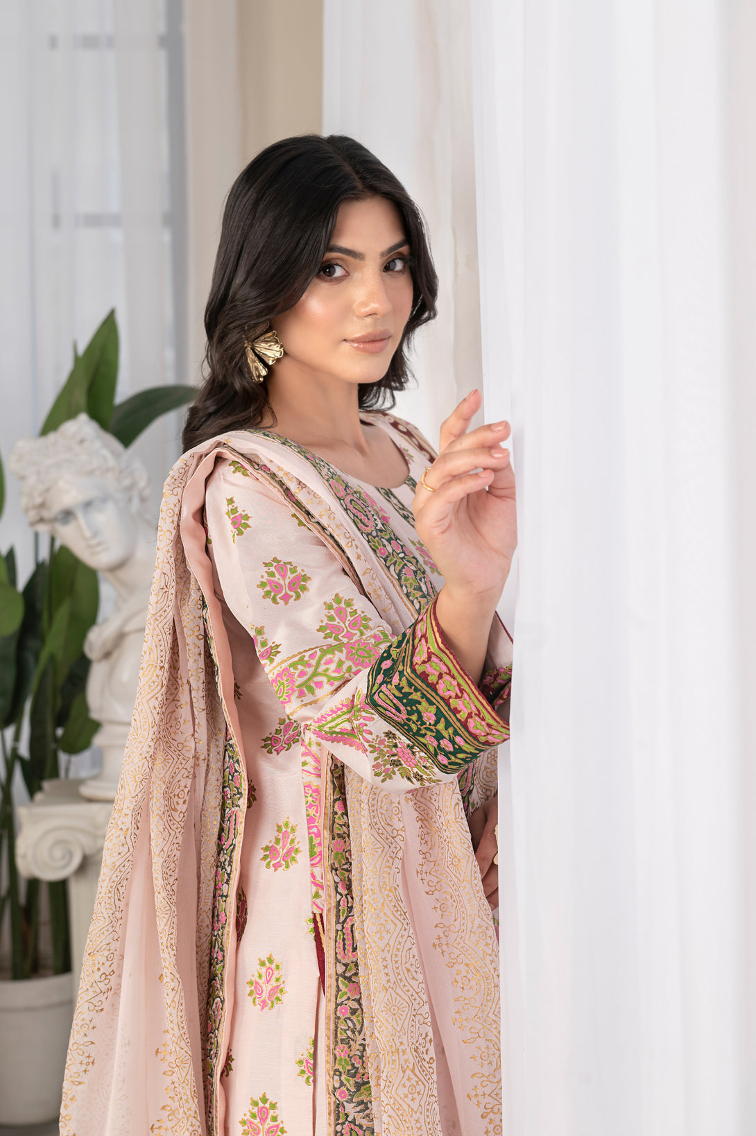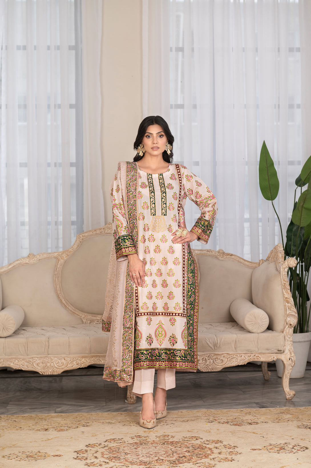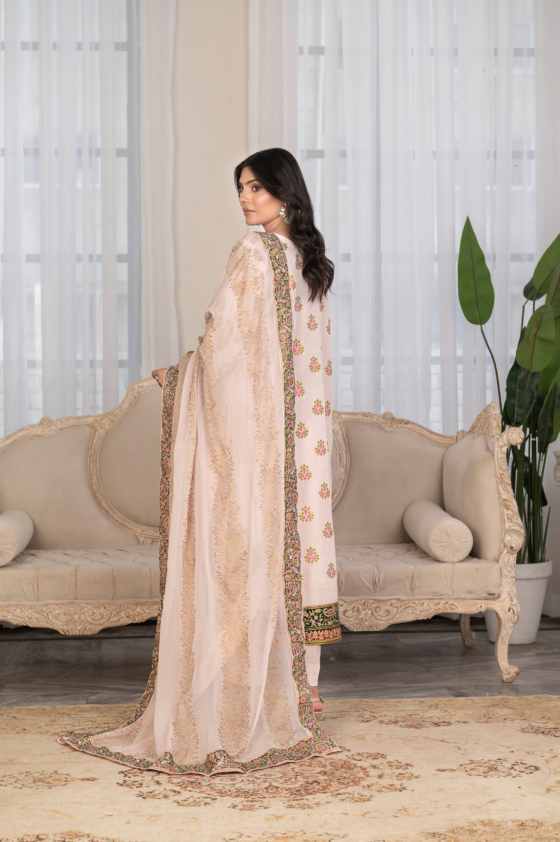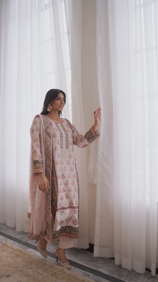 It is paired with straight silk pants for a refined silhouette. The ensemble is completed with a soft chiffon dupatta, beautifully adorned with a block print border all around and delicate motifs spread across the dupatta, finished with a luxurious Shamoos silk edging for a polished look.