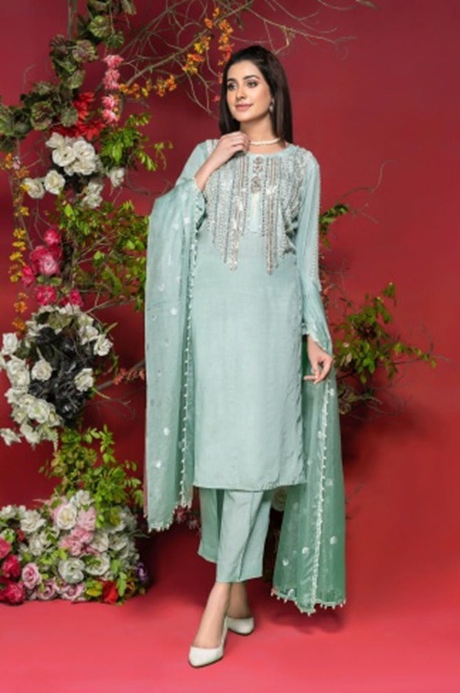 A unique epitome of refined elegance, this design truly combines grace and style laid out in appealing shades of sky blue. It comes with a straight raw silk shirt Incorporated with intricate handwork of scintillating Pearl, Sitara, Dabka, and tilla on the sleeves and neckline.