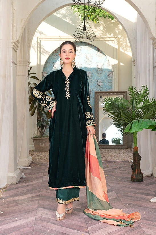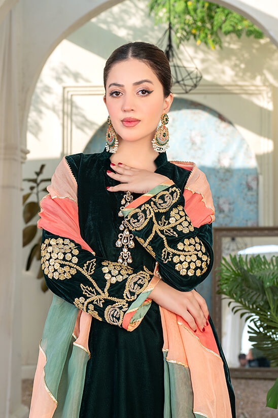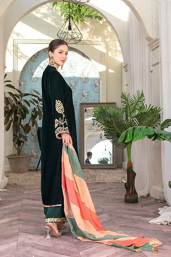 This elegant bottle green A-line shirt showcases intricate handwork with gotta, tilla, and dabka embroidery, adding a touch of opulence and charm. The neckline is beautifully finished with button patti, creating a refined look. It comes with silk plazzo pants featuring gotta work at the bottom, providing a stylish contrast. The silk dupatta in pastel shades is adorned with gotti and finished with tassels, making it a complete ensemble perfect for special occasions and events.