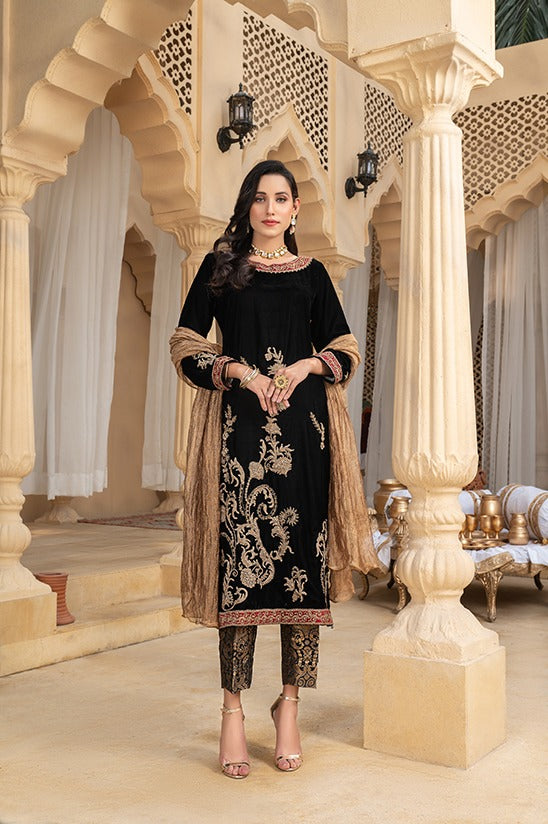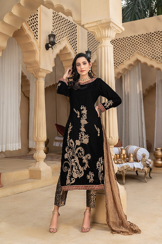 A straight Shiny Black Velvet Shirt, incorporated with captivating golden Tilla, Dori and Dabka handwork, further enhanced by dainty patches around neckline, sleeves and Daman, paired up with A customary Jamawar Trouser combining Copper and Black tones, and a shimmery copper colored Crush Silk Dupatta.