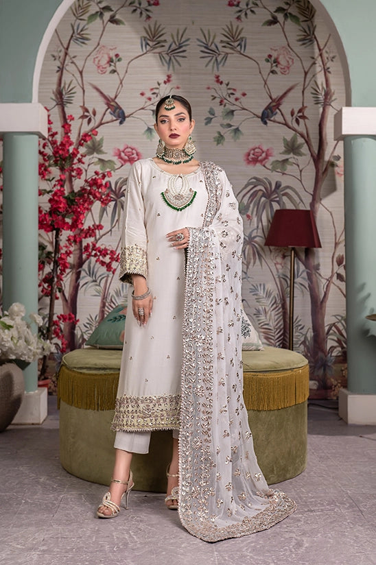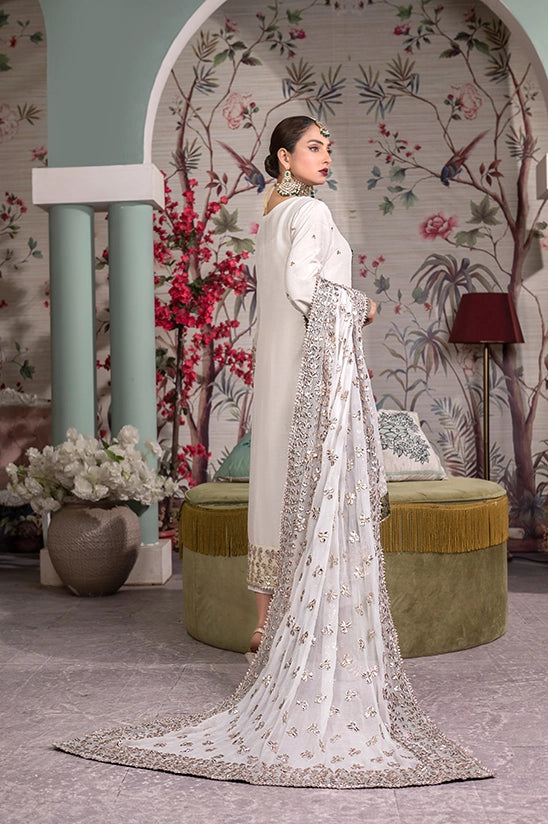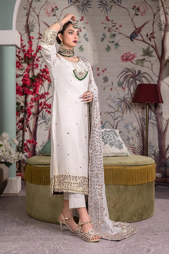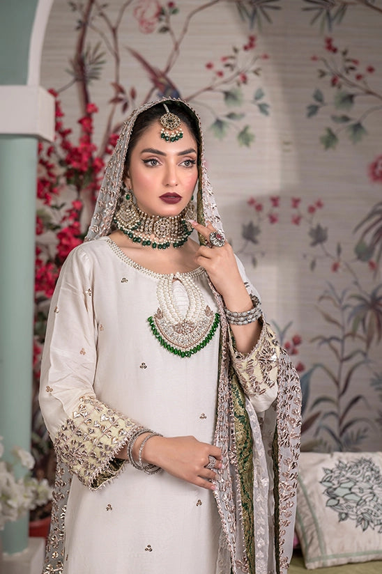 Embrace elegance with this beautiful white raw silk suit featuring intricate handwork of pearls snd stones on the neckline, complimented by gotta detailing on damn of shirt . Completed with a beautiful chiffon dupatta adorned with handwork of gotta and paired with straight sleek pants. It’s a harmonious ensemble that defines sophistication and elegance.
