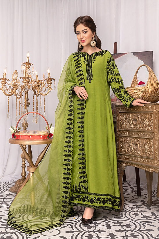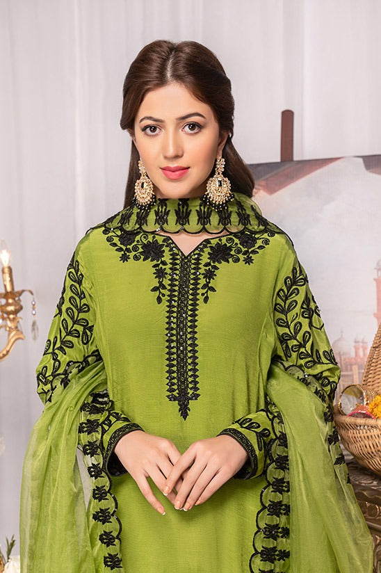 This vibrant and exciting ensemble is a pure depiction of grandeur and celebration. Shine out Loud in this fully bright and refreshing Mint Green Raw Silk Kalidar Shirt beautifully complemented with sophisticated and alluring black embroidery with a mix of shiny black Sitara work around the neckline, sleeves, and daman, matched up with a dazzling mint green Organza Dupatta embellished with dainty black embroidery all over the corners.