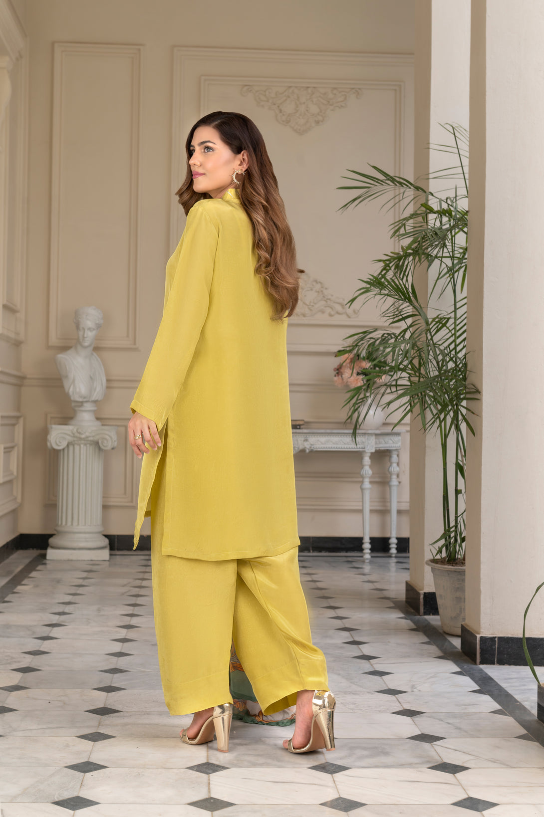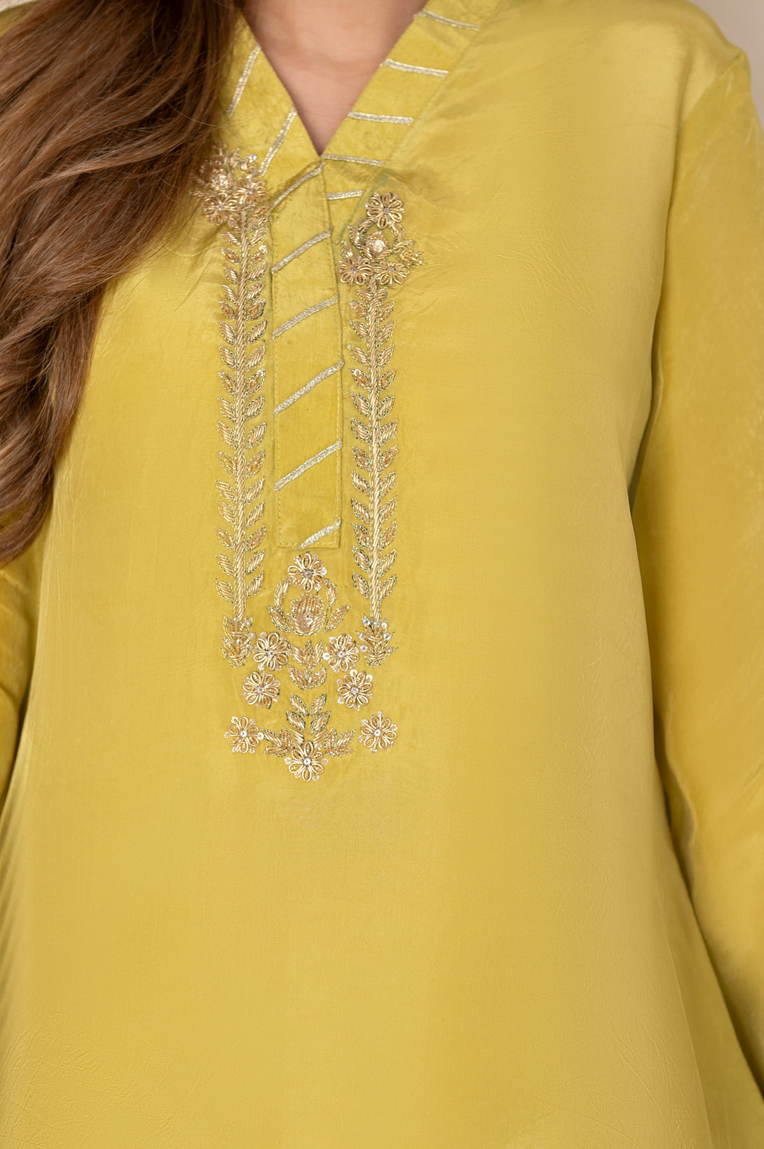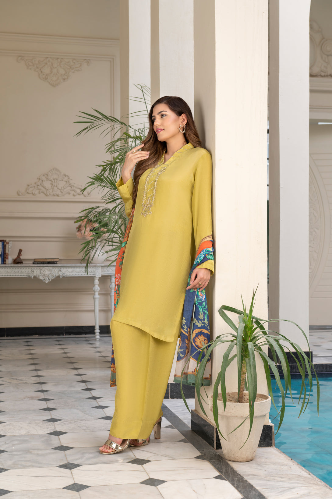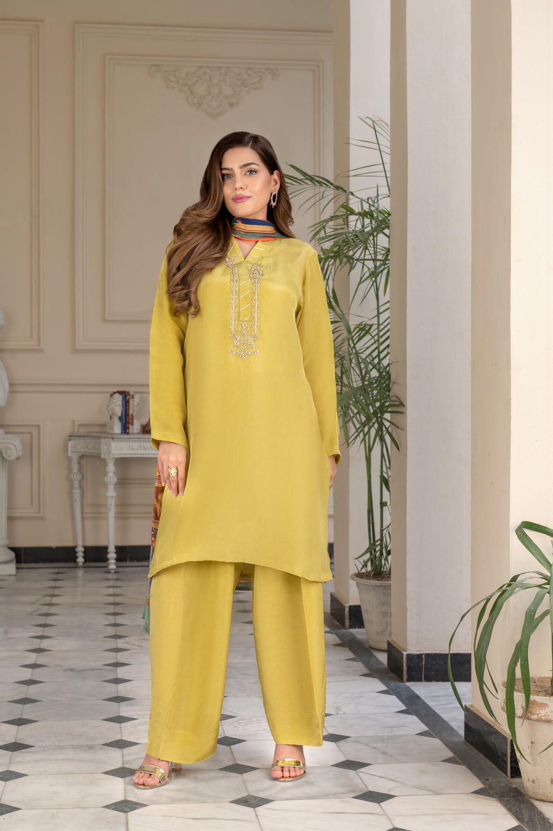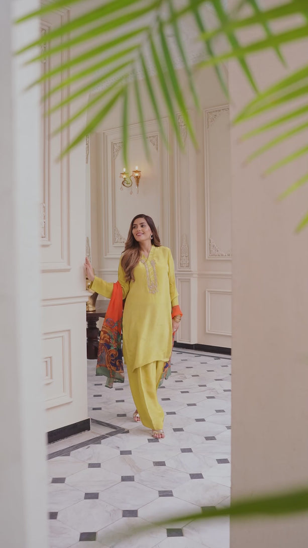 Zerin is an elegant silk creation that captures the beauty of traditional handwork with a modern edge. The silk shirt features exquisite hand embellishments of kora, tilla, and dabka on the neckline, adding a refined shimmer and regal charm.